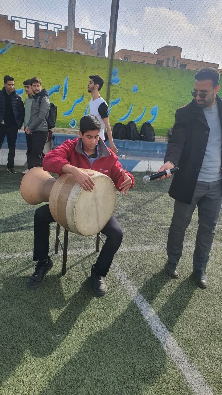 🔸️در کنار رقابت نفسگیر تیمها و اهدای مدال به تیمهای اول تا سوم، لحظاتی خاص و فراموشنشدنی رقم خورد. اجرای زیبای تنبکزنی توسط یکی از دانشآموزان، فضای مراسم را دلنشینتر کرد و تشویقهای پرشور تماشاگران، نشان از همدلی و انرژی بینظیر دانشآموزان داشت.
